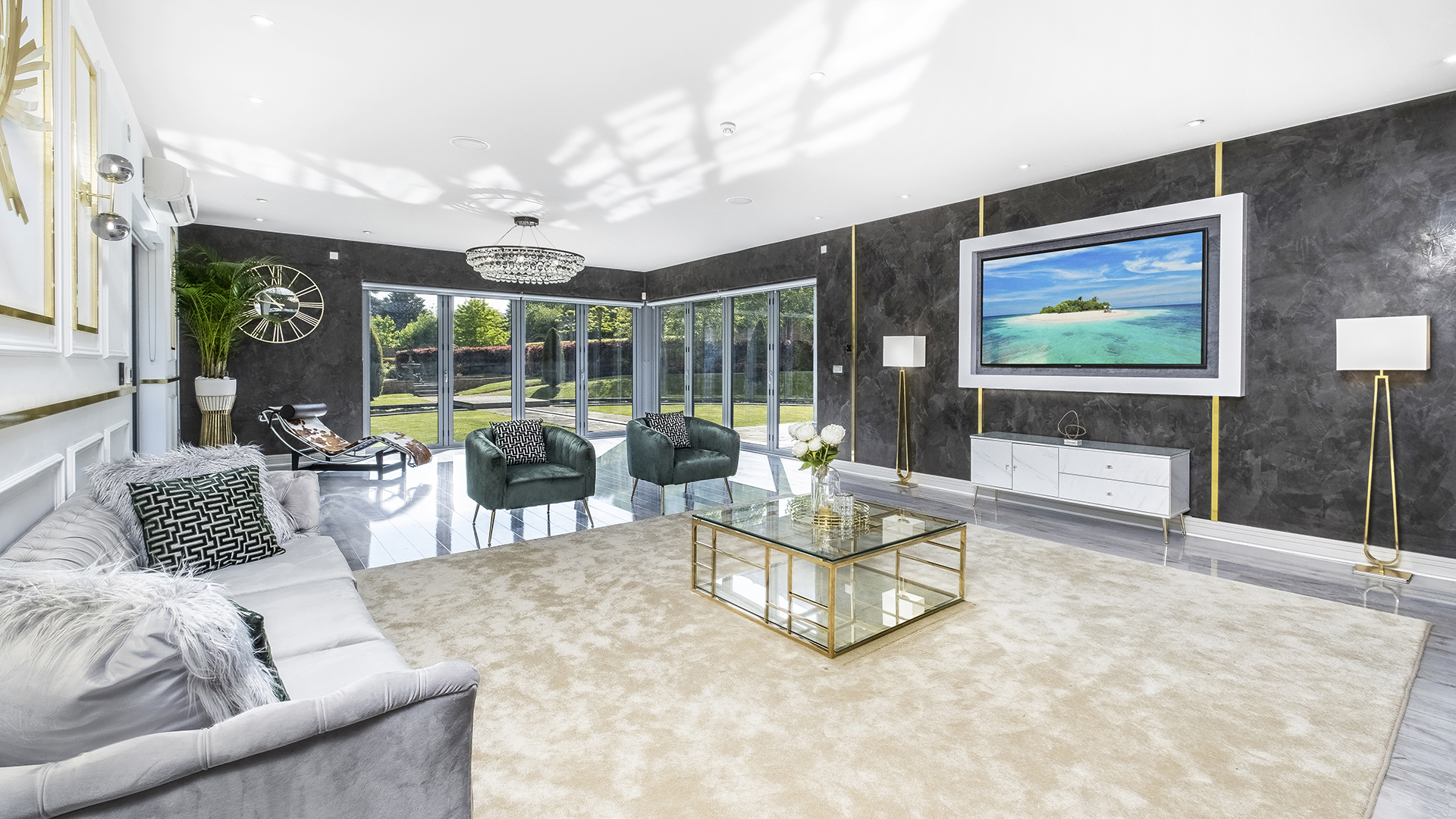 Located within 2 acres of landscaped gardens and surrounded by a charming moat with water fountains, this luxurious 7-bedroom mansion is the ultimate retreat for family staycations, special occasions, or a peaceful short stay. Equipped with state-of-the-art amenities, including a heated indoor swimming pool, cinema room, and games room, the property is perfect for creating unforgettable memories.